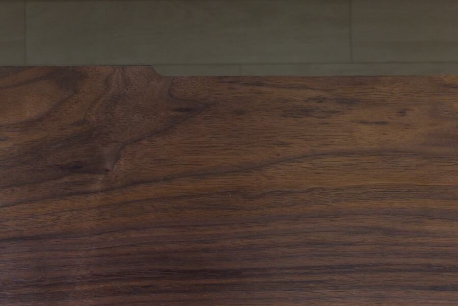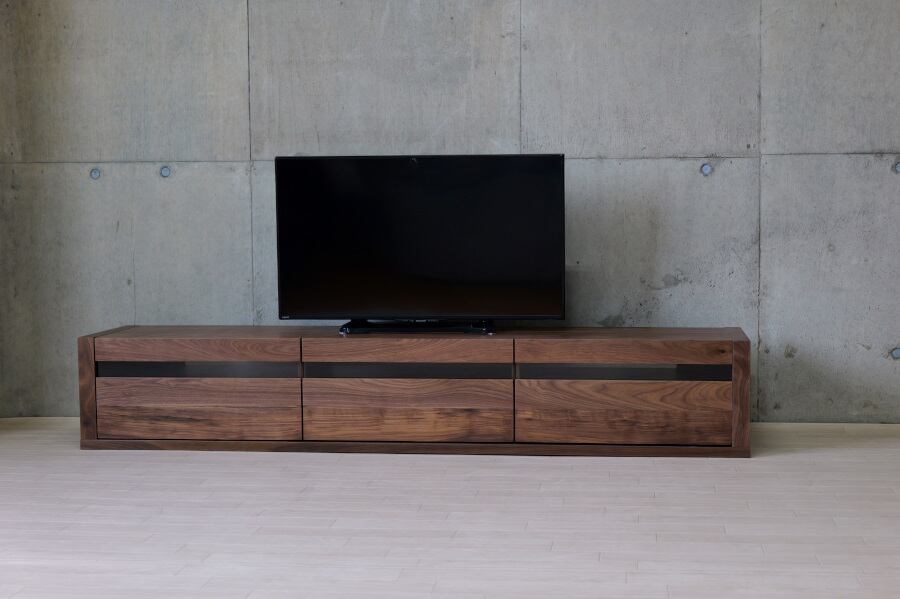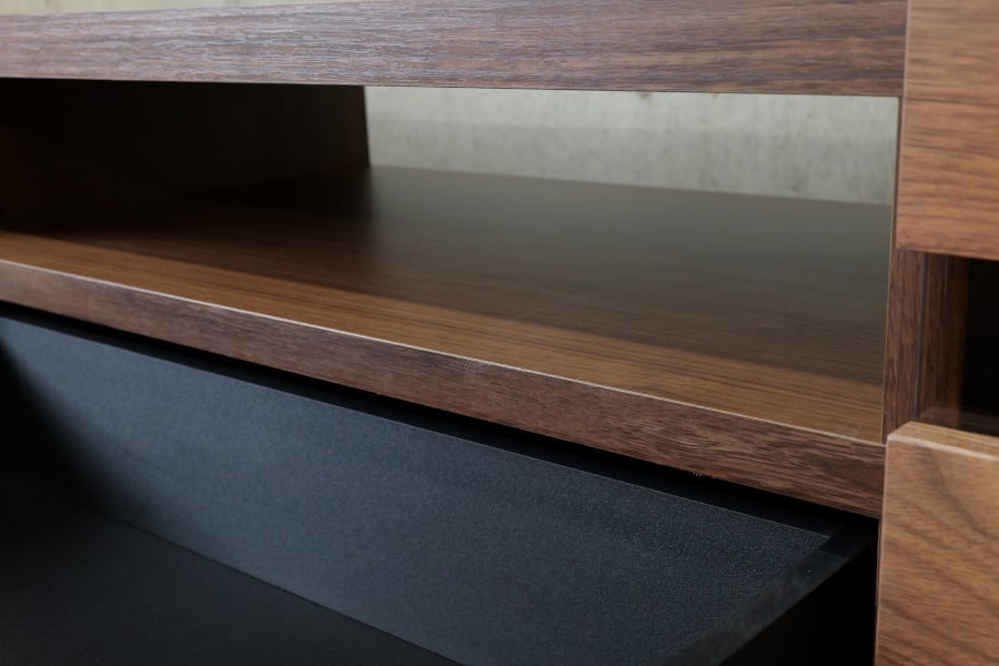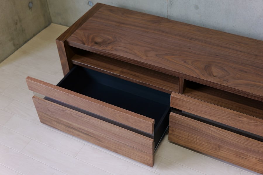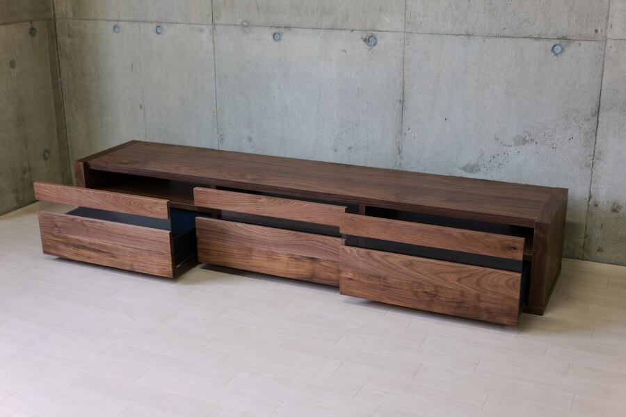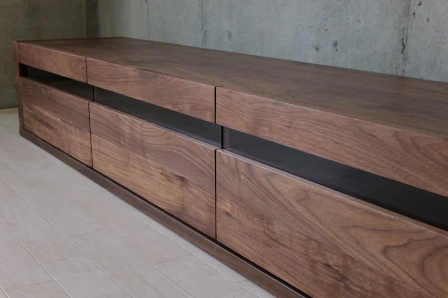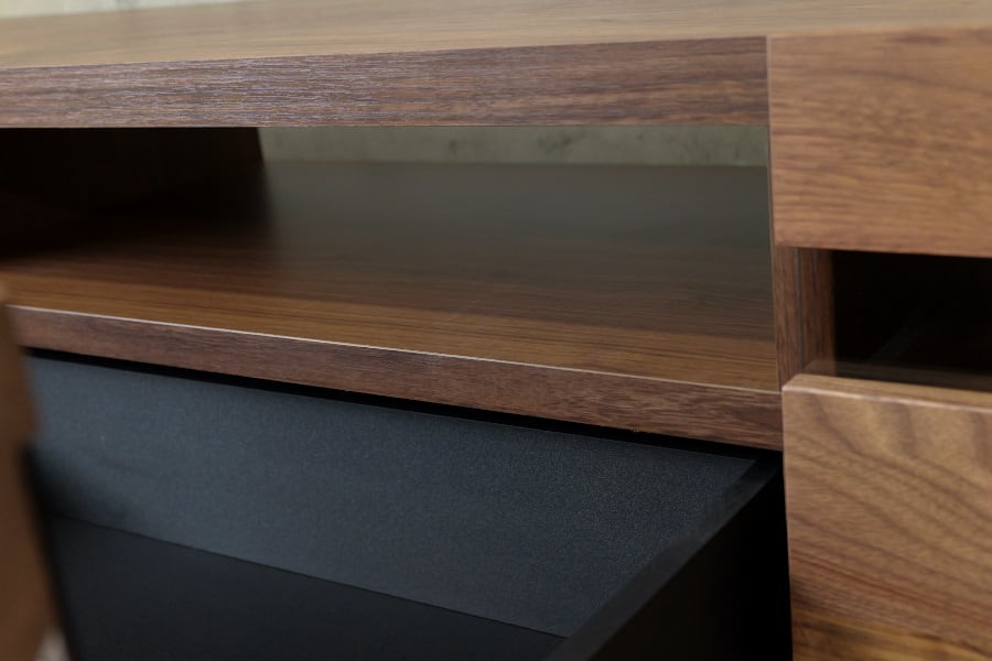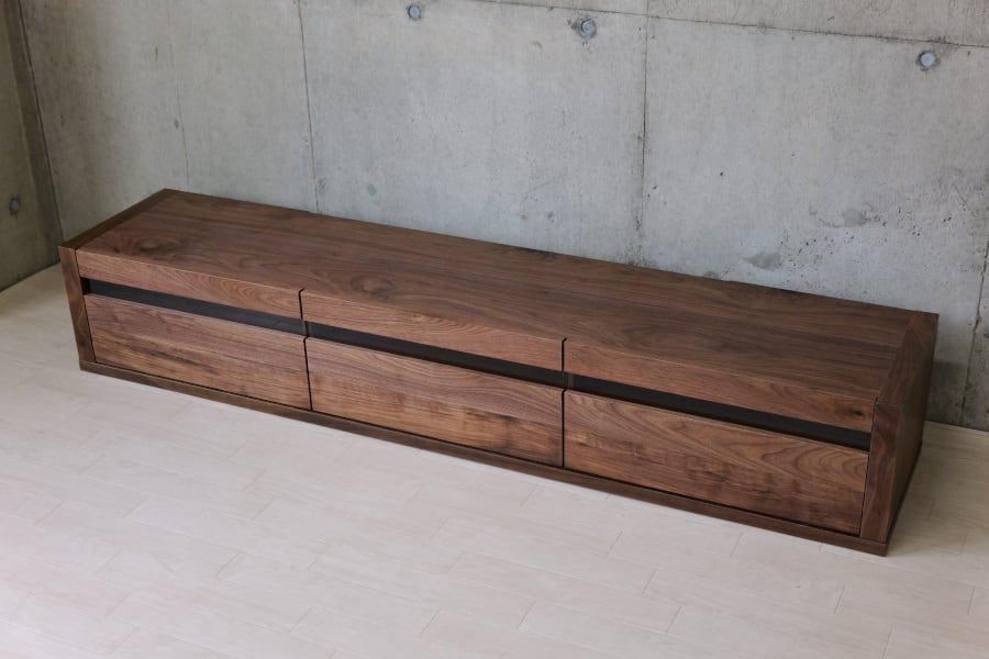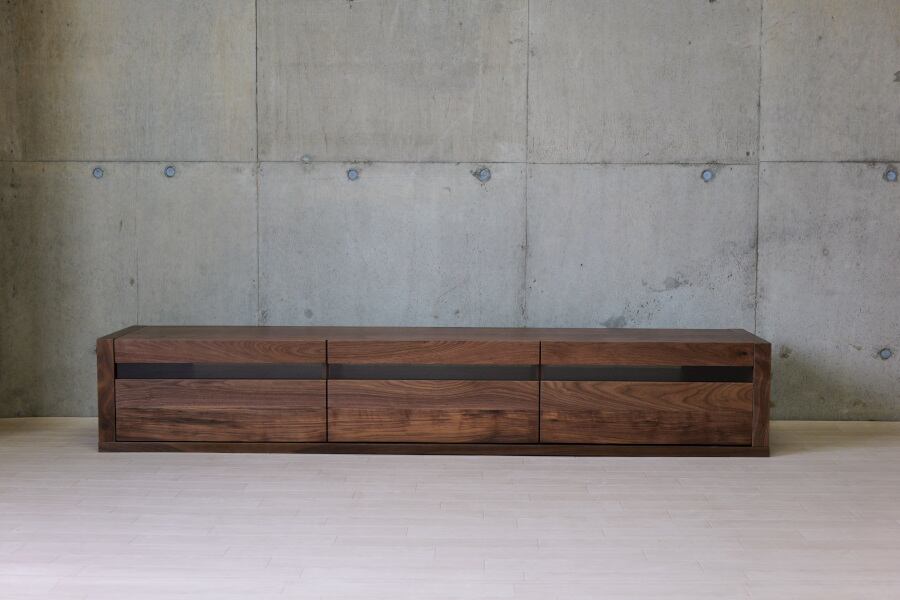 前板に無垢材を木目通しで用いて、本体の面材にも無垢を使い、正面からの印象をより良く仕上げています。引き出しの上部にはそれぞれデッキ収納が可能なスペースを配し、接続を簡易にするため背面はオープンにしています。コード配線をすっきりできるように、天板、敷台にサクリ加工を施しています。ガラスには飛散防止フィルムを貼ったブロンズガラス(強化)を用いて、デザイン性と機能性を両立させています。